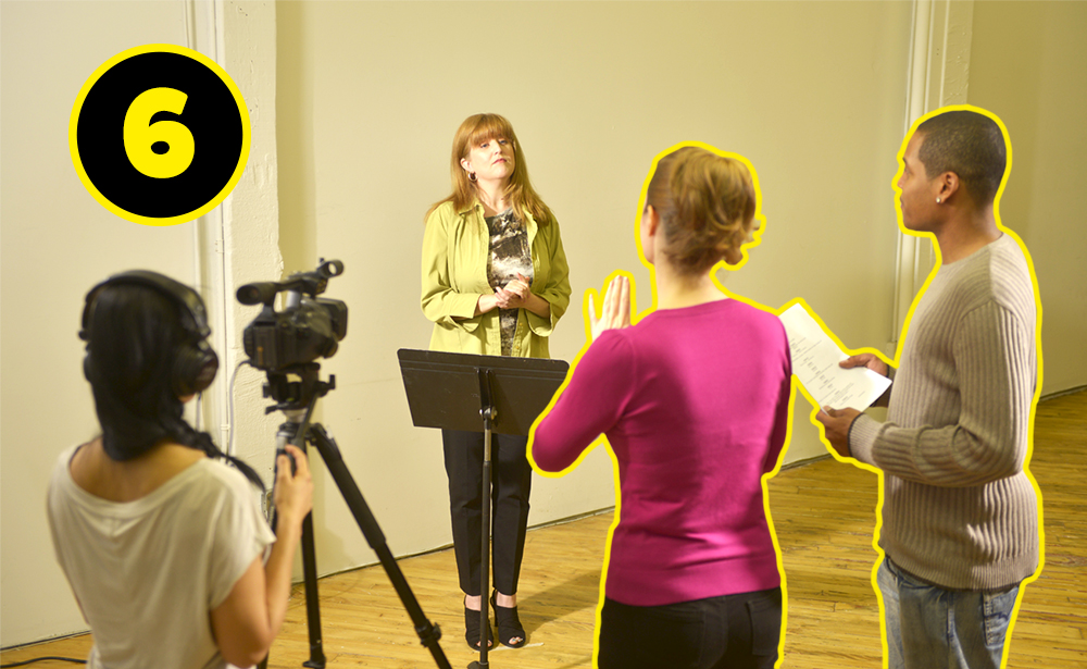 6. Sign Language Interpreter and Reader placement must be side-by-side, on the same side of the camera. The Deaf Actor can then see both Reader and Interpreter, and does not have to cross frame to do so.
